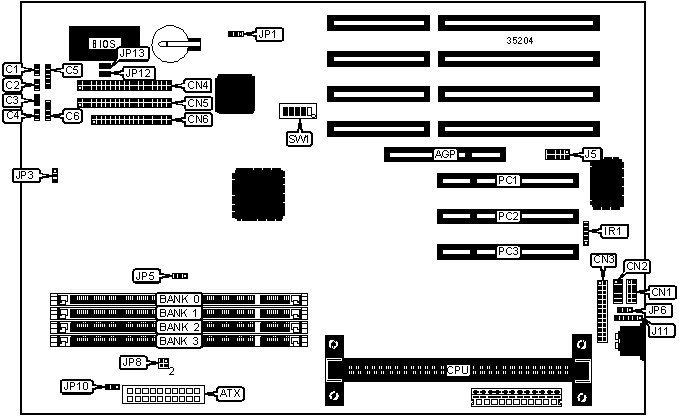 32-bit PCI slots (3), floppy drive interface, green PC connector, IDE interfaces (2), parallel port, PS/2 mouse interface, serial ports (2), IR connector, USB connector, ATX power connector, AGP slot |