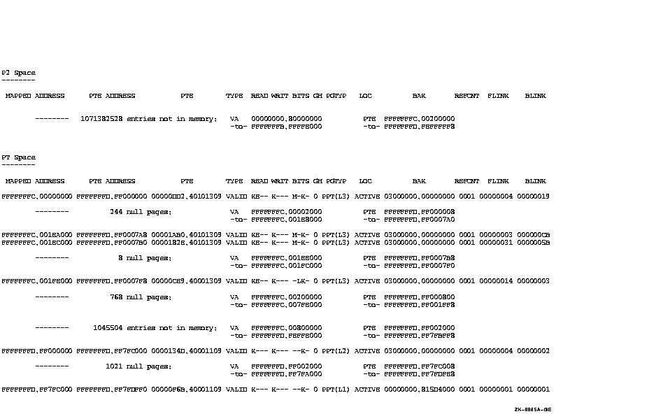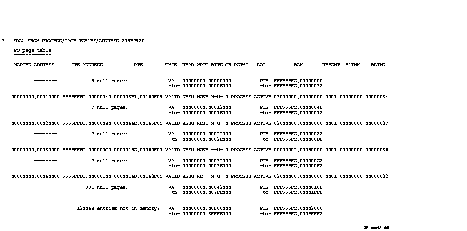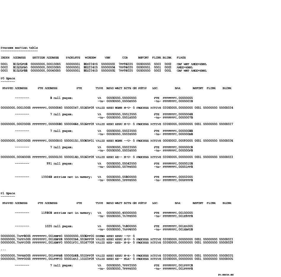 The P0 page table, P1 page table, and P2 page table displays, also produced by the /PAGE_TABLES qualifier, display listings of the process page table entries in the same format as that produced by the SHOW PAGE_TABLE command (see Tables SDA-13 through Table SDA-18.)