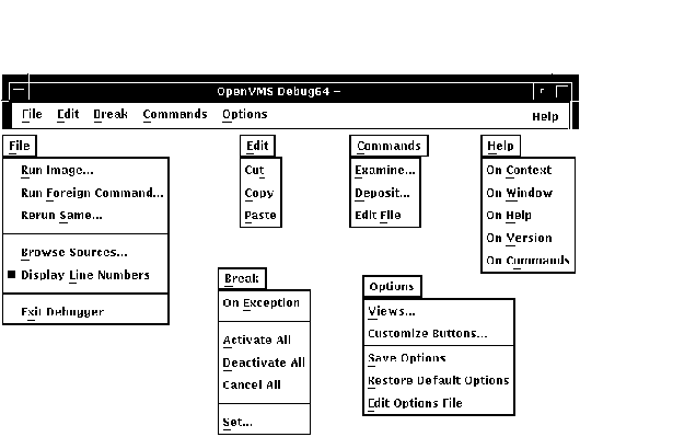 | Edit Options File | Load and display the user-specific resource file DECW$USER_DEFAULTS:VMSDEBUG.DAT in the debug editor for review and modification. | |