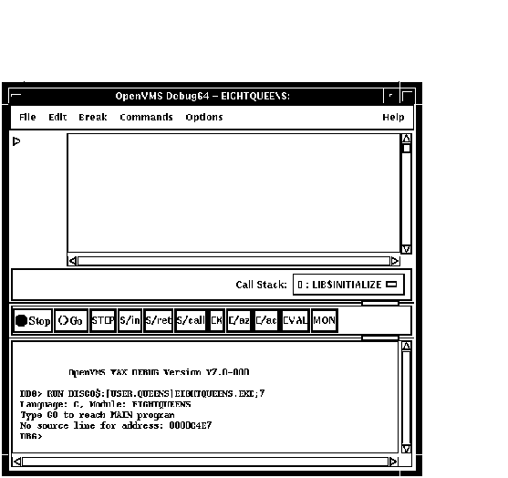 The message displayed in the command view indicates that this debugging session is initialized for a C program and that the name of the source module is EIGHTQUEENS.