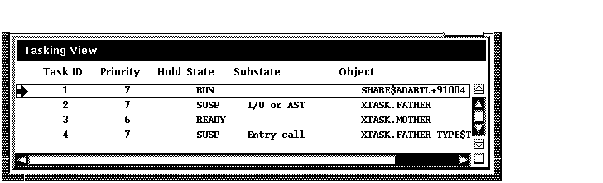 | Tasking view | List all the existing (nonterminated) tasks of a tasking program. Provides information about each task and allows you to modify the state of each task. |