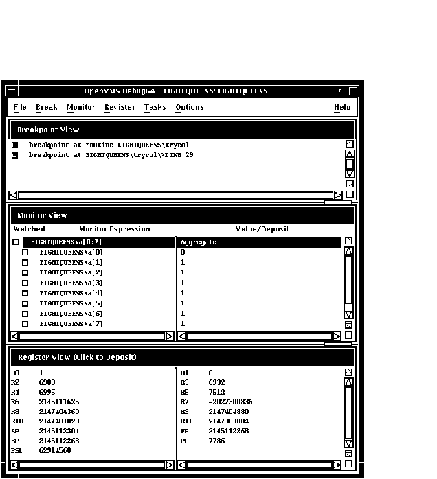 Figure 8-5 shows a possible configuration of the breakpoint view, monitor view, and register view, as a result of the selections in the View menu in Figure 8-4.