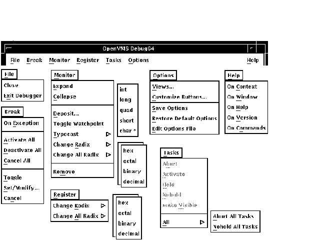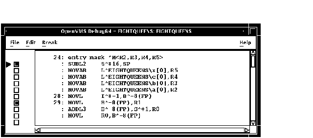 | Edit Options File | Load and display the user-specific resource file DECW$USER_DEFAULTS:VMSDEBUG.DAT in the debug editor for review and modification. | |