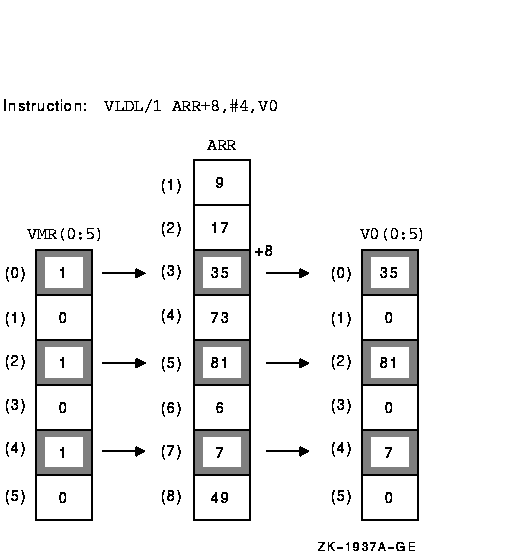 In the next example, the same VVADDF instruction is performing a masked operation. The instruction qualifier /1 specifies that elements that match the set bits (bit value 1) in VMR are operated on.