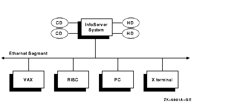 Figure 23-1 shows the relationship of the InfoServer system to several possible client systems. In this figure, two compact discs and two hard disks connected to the server appear to the client systems as local devices. The VAX system and the RISC workstation might be using one or two of the compact discs for software distribution and online documentation, while the PC might be referencing a disk partition on the InfoServer system. The X terminal boots from the InfoServer system and uses InfoServer disks for page, font, and customization files.