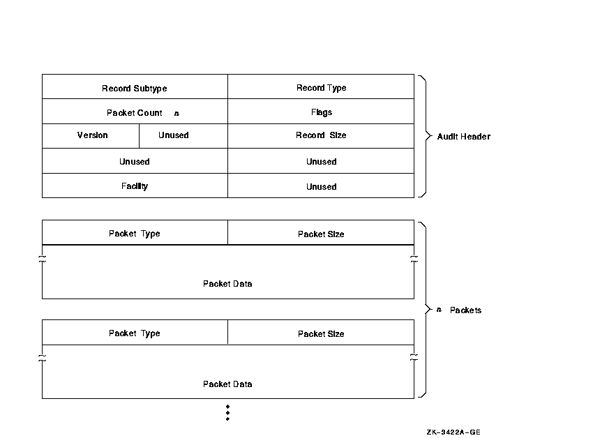Each security audit record consists of a header packet followed by one or more data packets, as shown in Figure F-1. The number of data packets depends on the type of information being sent. This appendix describes the format of the audit header and its data packets as well as the contents of the data packets.