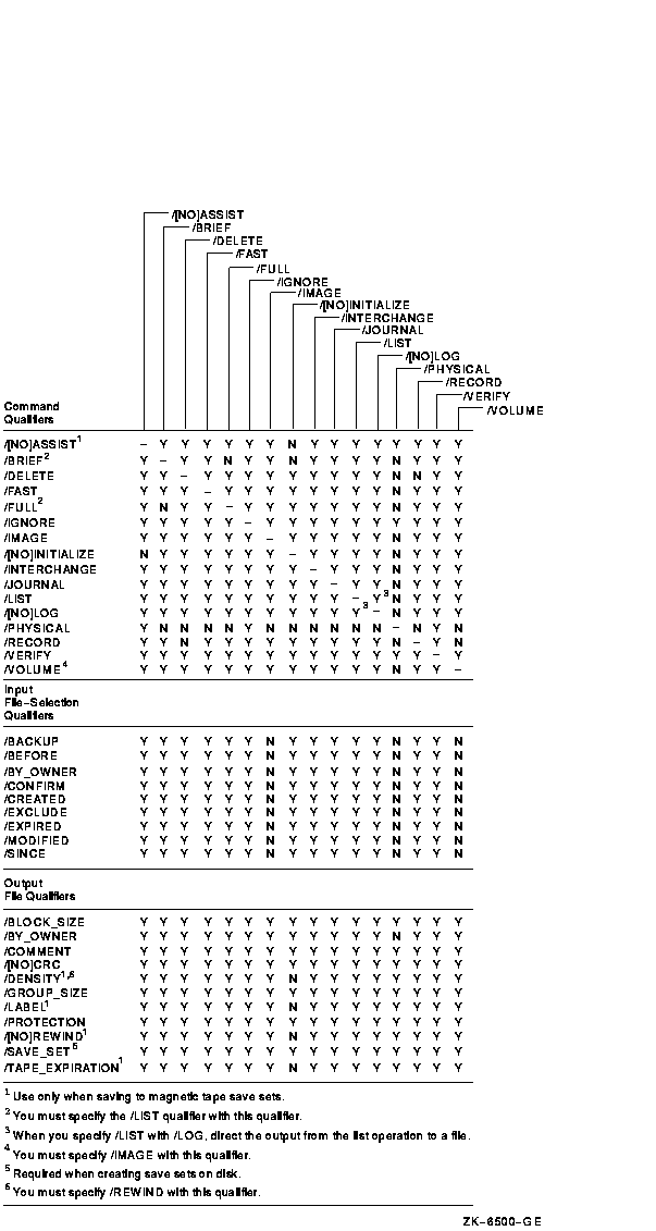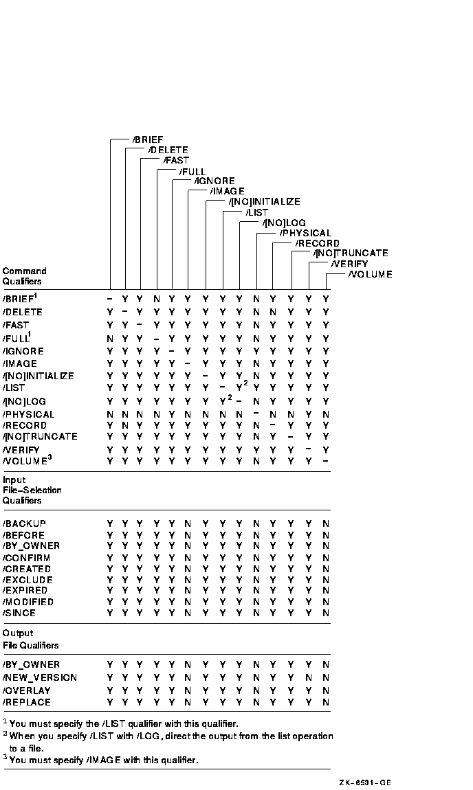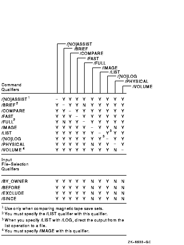 The following figures show the qualifiers that can be used in BACKUP save, restore, copy, compare and list operations. The figures also indicate valid combinations of BACKUP qualifiers.