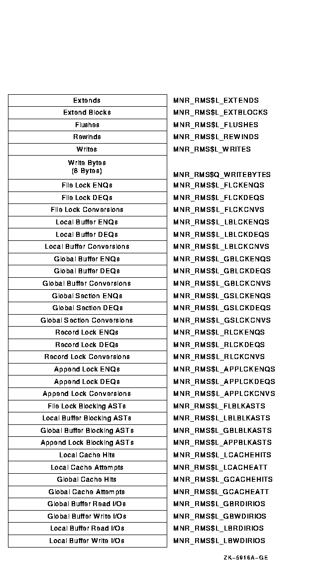| Global Buffer Write I/Os | MNR_RMS$L_GBWDIRIOS | Count of global buffer write I/Os for the file (longword,C) |