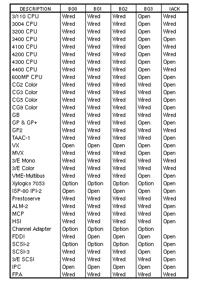 Volume I: Slot AssignmentVMEbus Bus Grant and Interrupt AcknowledgeThis chart shows how the Bus Grant In/Out and Interrupt Acknowledge In/Out signals are connected on the board. Wired signals are not used. Open signals are selected with backplane jumpers. Option signals are enabled on the board and on the backplane.