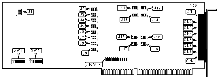 Note:J2 - J9 control the configurations of CN1 - CN8, respectively. Each RJ-11 port may be configured differently.