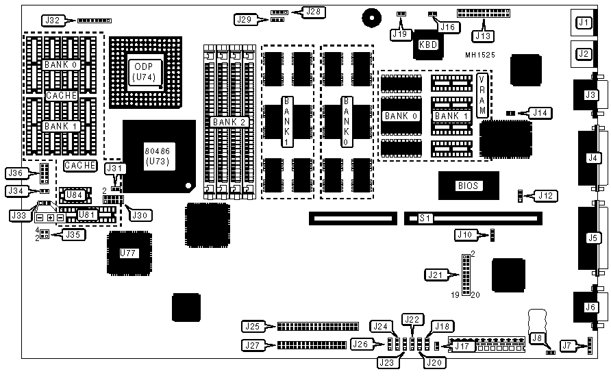 Note: If Bank 1 sockets are omitted from board, board was factory installed with 1MB of VRAM. Bank 0 is soldered to the board. |