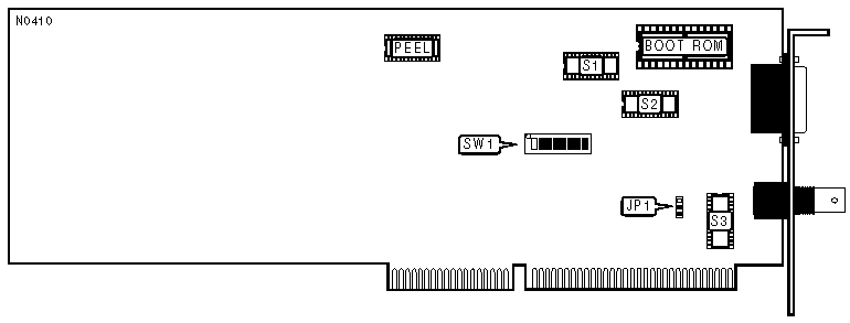 Notes:S1 and S2 are sockets for a transformer chip while S3 is a socket for a Cabling Option Resistor Kit (CORK). To choose a cable type insert the appropriate chips into the appropriate sockets. All cards on the network segment must use the same type of coaxial cable.